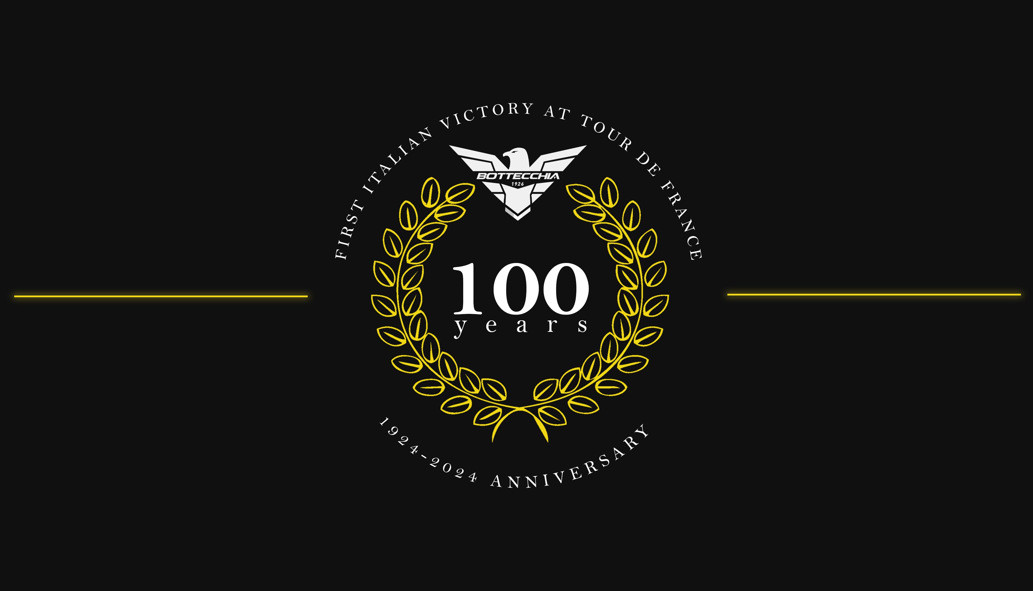 Bottecchia Cicli 以“Bottecchia Centenary”徽标纪念这一重要周年纪念日,纪念意大利首次在环法自行车赛上获胜 100 周年,这是一项重要的意大利纪录,注定将永远铭刻在自行车史上。标志将“100年”置于中心,象征着一个故事的长寿,随着时间的推移而继续存在,比以往任何时候都更加生动。它周围有一个月桂花环,这是过去体育庆祝活动获胜者额头上环绕的传统符号。与其他产品不同的是,这款产品是黄色的,明显参考了环法自行车赛。